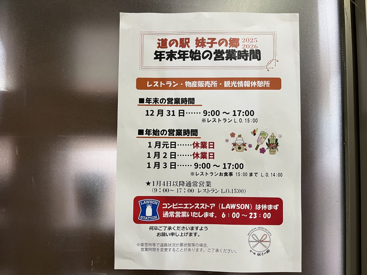 道の駅「妹子の郷」の年末の営業は、2025年12月31日(水)17:00まで、年始は1月3日(土)9:00からの営業となるそうです。なお、同施設内にあるコンビニエンスストアは、休まず通常営業とのことです。