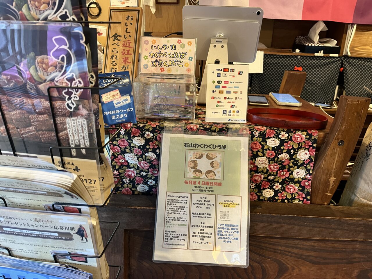 また、お店の中には、湖舟が、石山地域周辺のイベントや事業体との活動とも、コラボレーションしている様子が伺えます。この地域の歴史を知り、そこに在する人々との関わりの中で、地元に息づいた温かなお食事処であることが伝わってくるようです。
