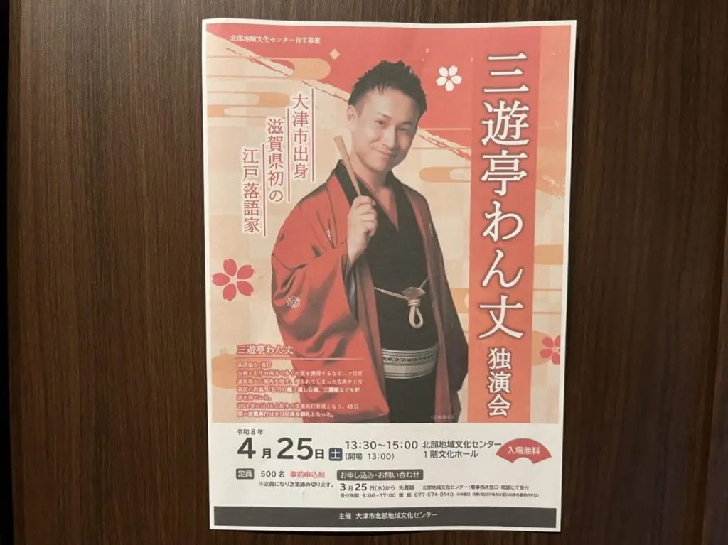 大津市出身で、滋賀県初の江戸落語家である、三遊亭 わん丈(さんゆうていわんじょう)氏による独演会が、2026年4月25日(土)に堅田の北部地域文化センターにて開催される予定だそうです。3月25日(土)から、申込受付が開始予定となっています。