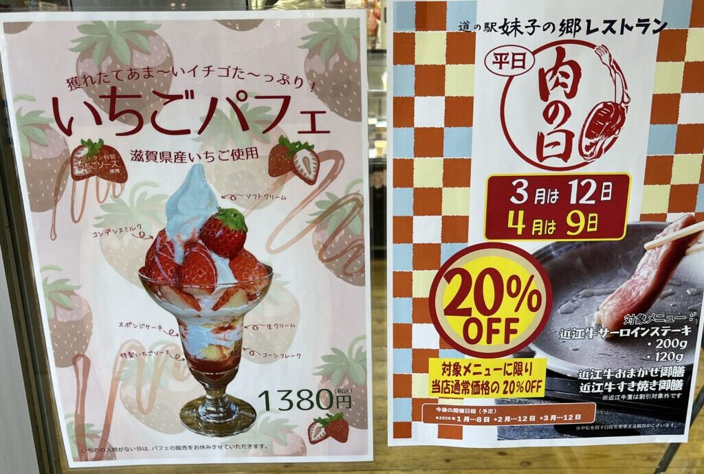 レストランでは、いちごパフェも始まっているそうです。公式Instagramによると、物産販売所で販売している新鮮な滋賀県産いちごとソフトクリームが使われたパフェとのことで、穫れたていちごのあまさをたっぷりと味わいながら、いちごソースや生クリーム、スポンジケーキなどとの組み合わせを楽しむことができそうですね。